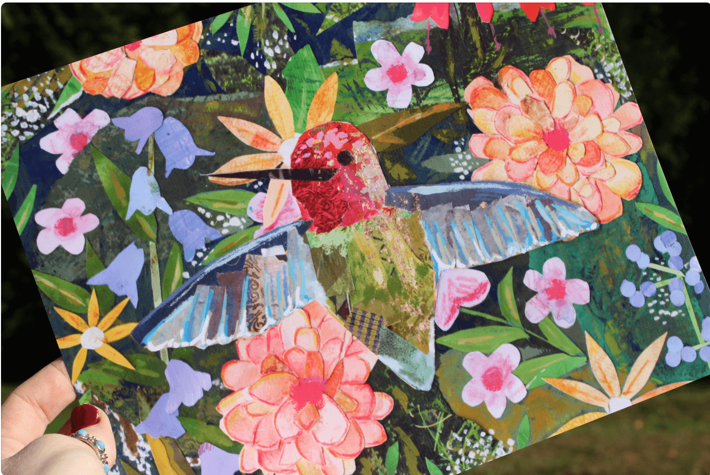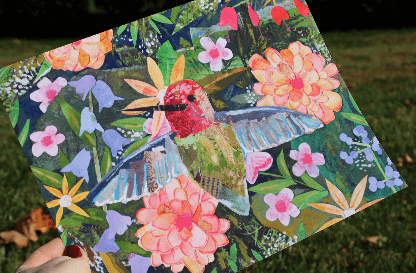 hummingbird art print, bird collage, botanical wall art, nature-inspired decor, blooming garden artwork, mixed media bird, hummingbird illustration, garden bird print, floral bird art, original bird collage