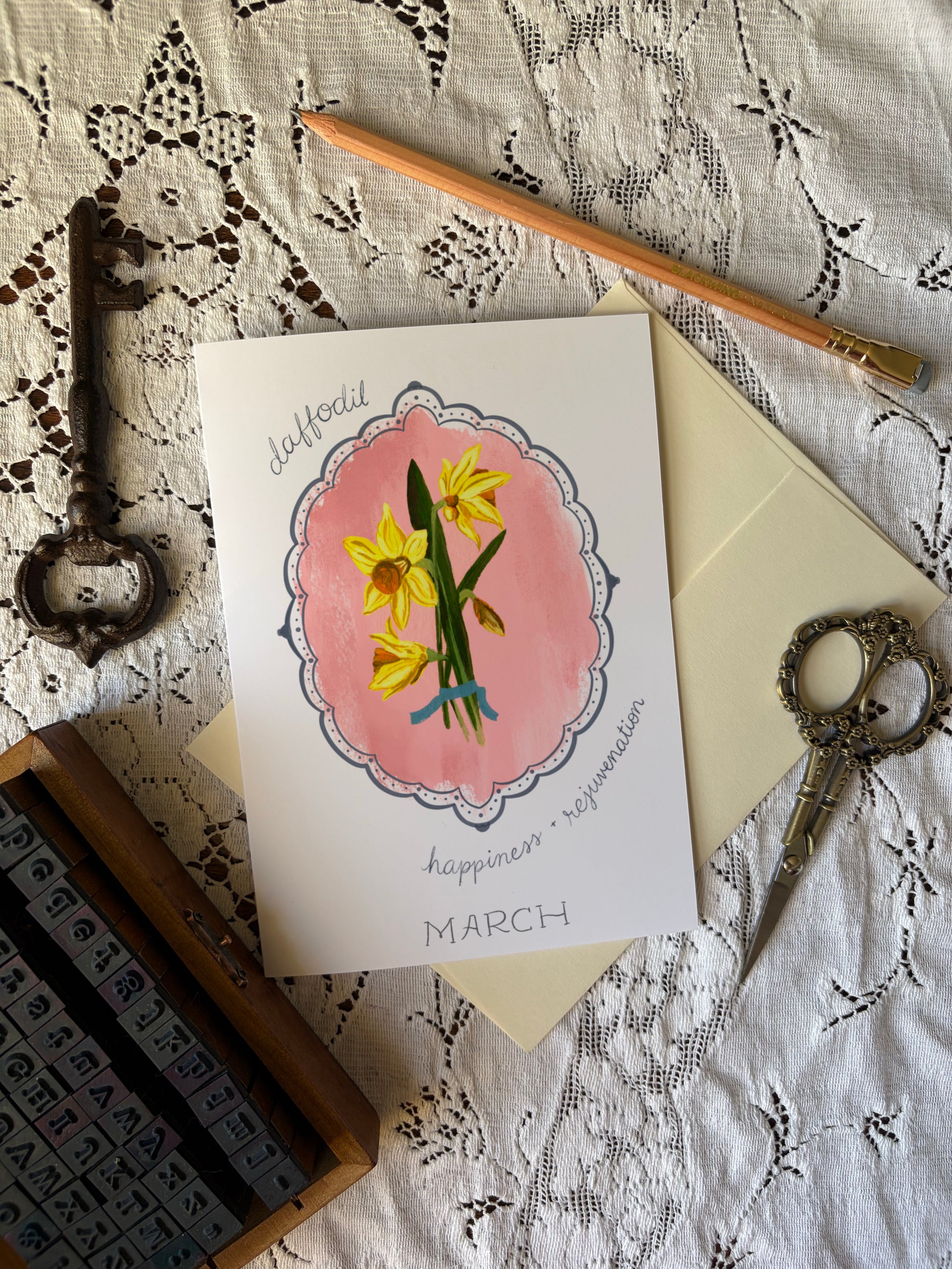 March Birth Month Flower Greeting Card- Daffodil Flower Birthday Card – Vintage Botanical Art for Spring, Joy & New Beginnings