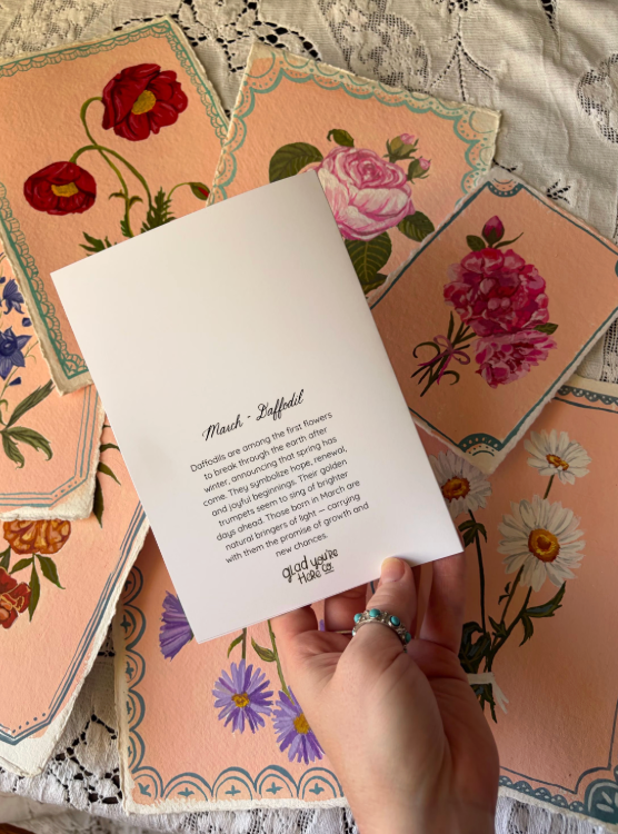Printed on professional archival paper, the card is blank inside to allow your personal message, while the front features a gouache vintage floral design and the back describes a deeper meaning and charm.