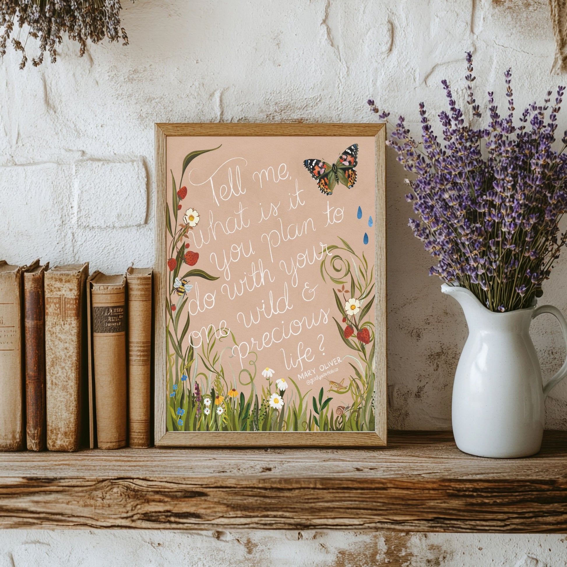 “Tell me, what is it you plan to do with your one wild & precious life?” — printed from a hand‐painted gouache design, this Mary Oliver quote art print brings poetic inspiration, botanical beauty, and warm nature vibes into your home. Perfect as wall decor for living room, bedroom, office or gifting for nature lovers & poetry fans.
