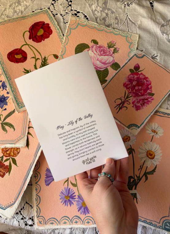 Printed on professional archival paper, the card is blank inside to allow your personal message, while the front features a gouache vintage floral design and the back describes a deeper meaning and charm.