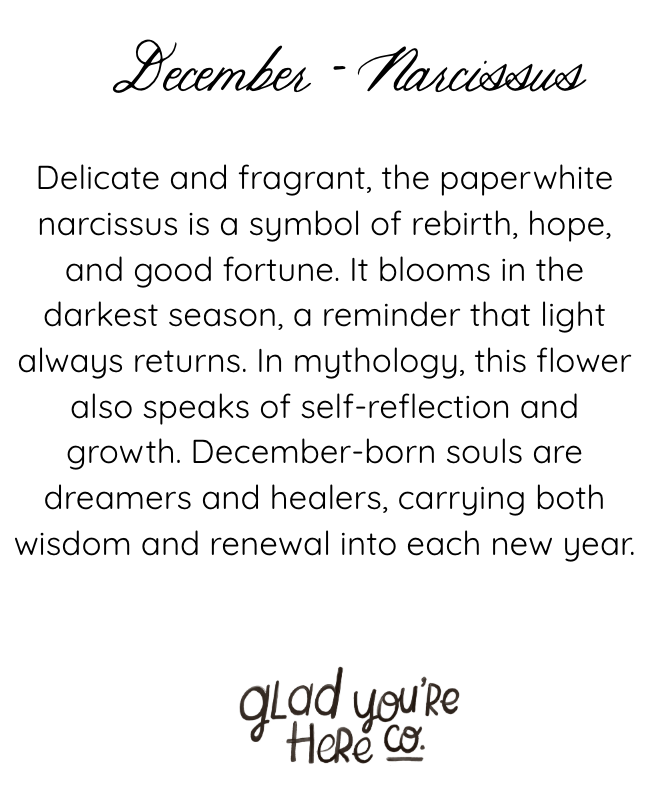Close the year with grace and optimism through this original Narcissus flower painting, the official birth month flower for December. A symbol of prosperity, hope, and good wishes, the narcissus (commonly known as paperwhite) is a delicate yet powerful floral emblem perfect for gifting or personal reflection.