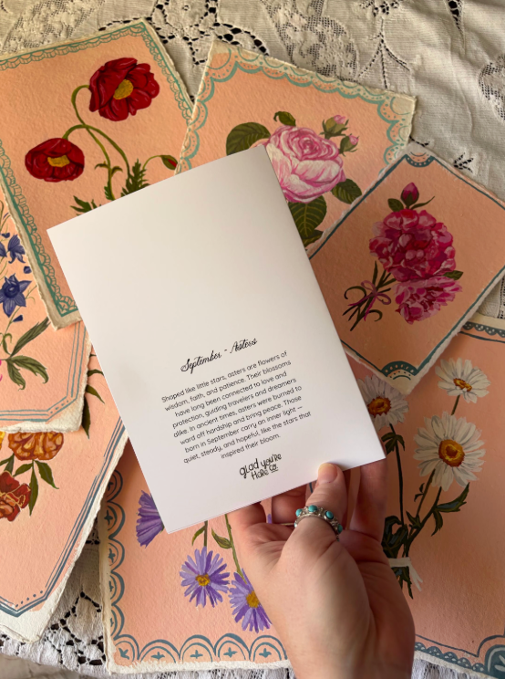 Honor the quiet strength and grace of September with this Aster Birth Flower Greeting Card, showcasing a hand-painted aster bloom in soft, layered detail. The aster, a symbol of elegance, faith, and valor, makes this card a meaningful way to celebrate birthdays, share encouragement, or mark personal milestones.